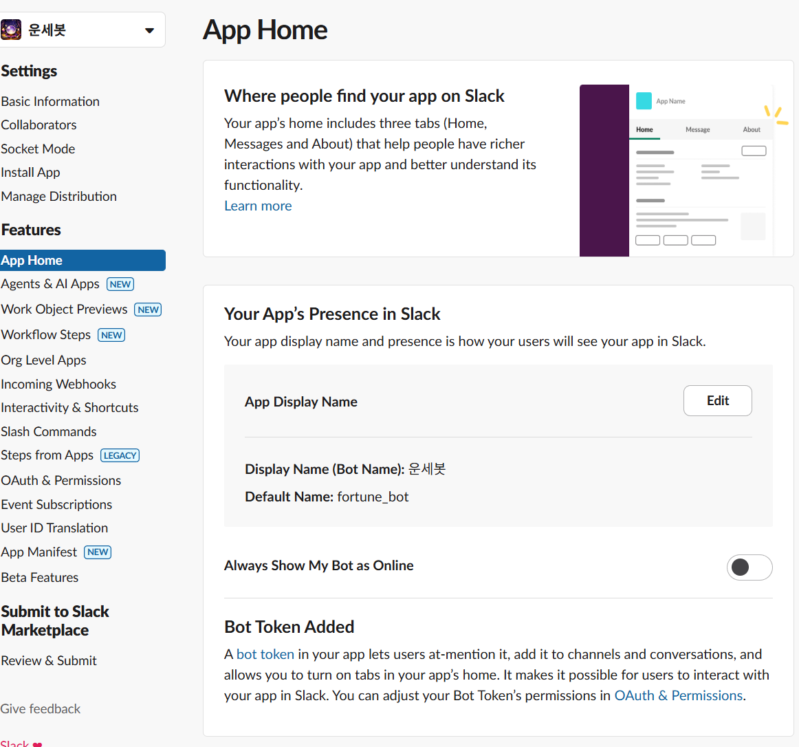 다음으로는 App Home 탭으로 가서, bot 인 앱이므로 봇 프로필을 만들어줘야 한다. 수정 가능하니 일단 대충 생성.