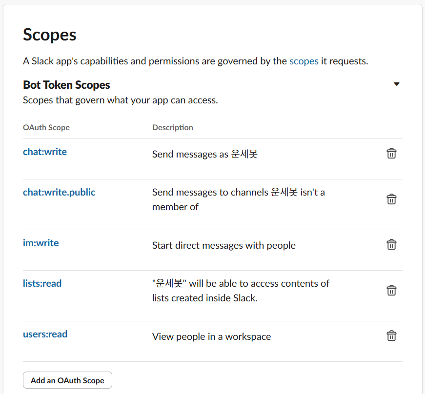 중간쯤에 Scopes 가 있는데, 앱의 기능과 권한을 지정하는 곳. 우리는 간단한 운세 봇이라, 사용자의 권한을 대행하지 않아도 괜찮으니, 봇 토큰 권한만 지정해보자.