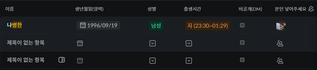 운세에 필요한 정보들인, 생년월일(귀찮아서 양력만 지원 예정), 성별, 출생시간(모름 가능), 현재 구상으로는 공개면 채널에 메세지로 같이 공개되고, 비공개 체크를 하면 DM으로 받아볼 수 있게 만들고... 마지막으로 본인확인을 위한 유저태그