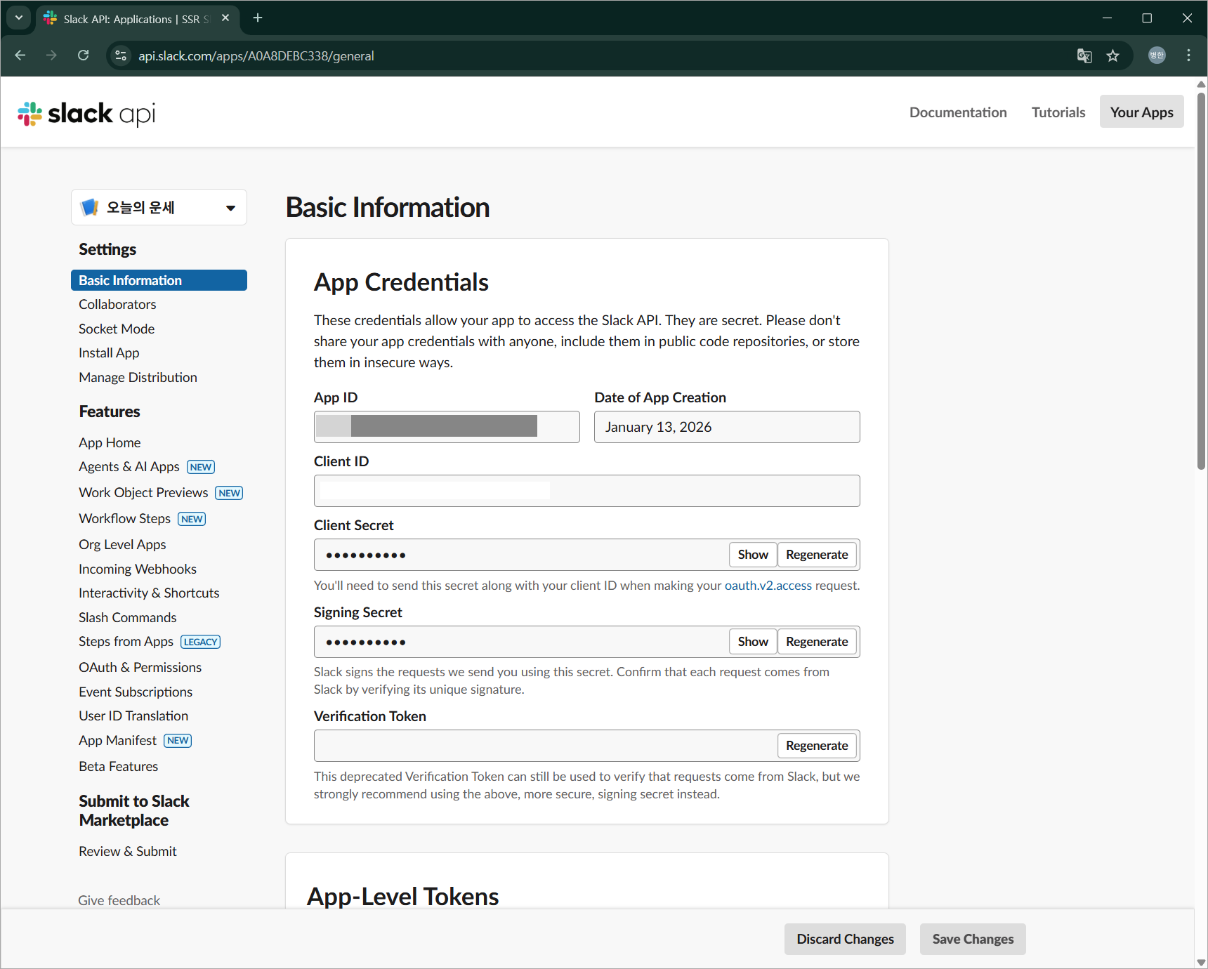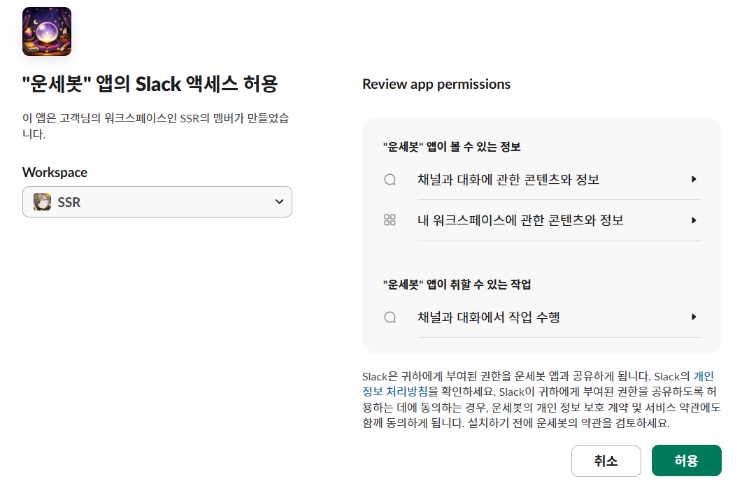 액세스 권한을 확인하고 허용을 해 주면, 이제 비로소 앱이 워크스페이스에 추가된다! 일단 이게 되어야 하는 것이 중요한게, 이때부터 Bot User OAuth Token 이 생성되기 때문에...