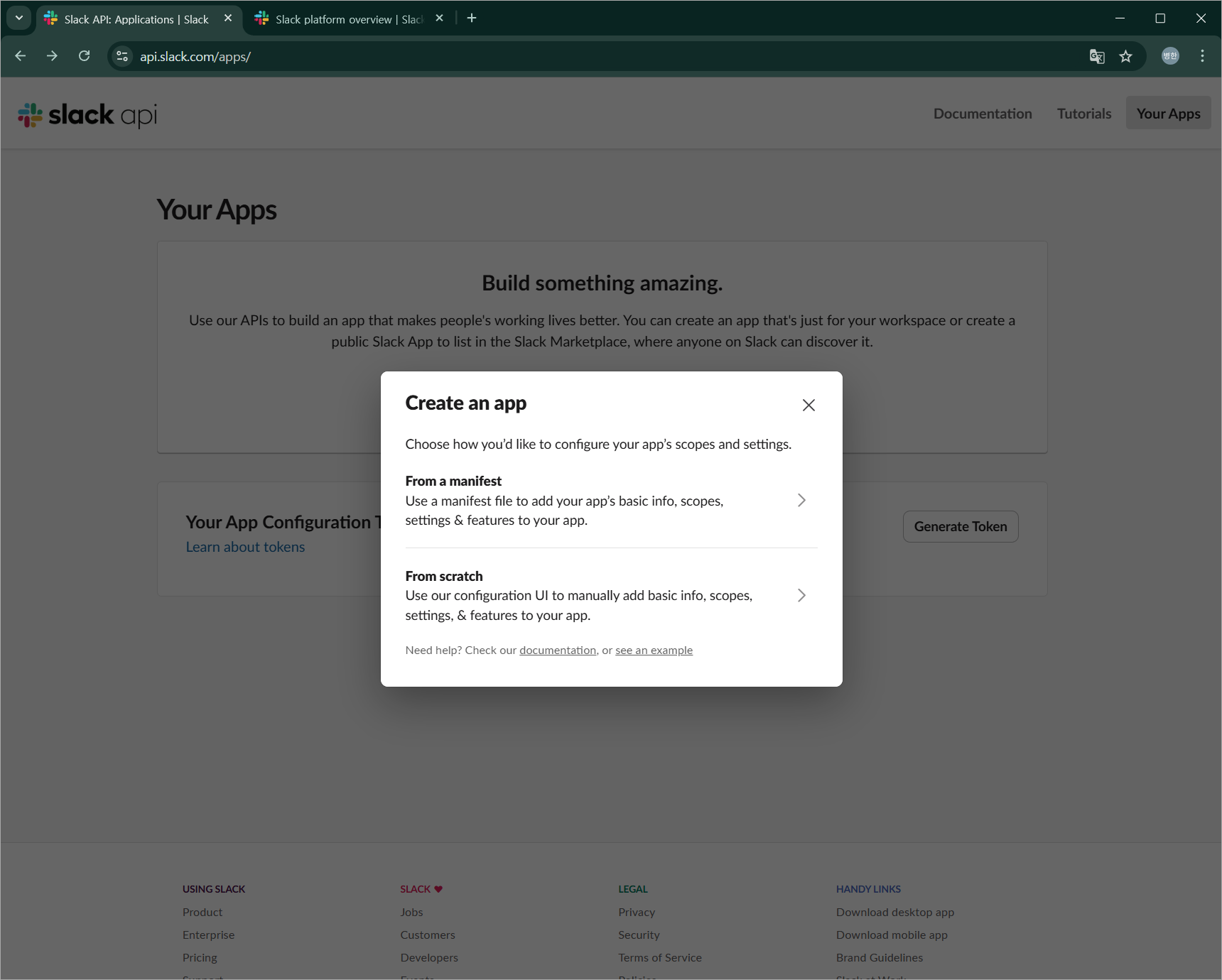 manifest 와 scratch 방식이 있는데, 매니페스트는 앱 설정을 YAML/JSON 으로 관리하는 방식이고, 스크래치는 관리 콘솔 UI 에서 그냥 선택하는 방식이다. 일단은 뭘 잘 모르니 스크래치로 시작.